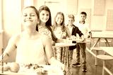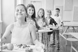 Smiling students standing in line holding food trays