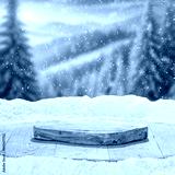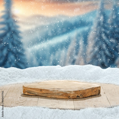 Wooden board cover of snow and frost. Blurred landscape of mountains and forest. Snowflakes and natural sun light. Empty space for your products. Mockup background with pedestal.