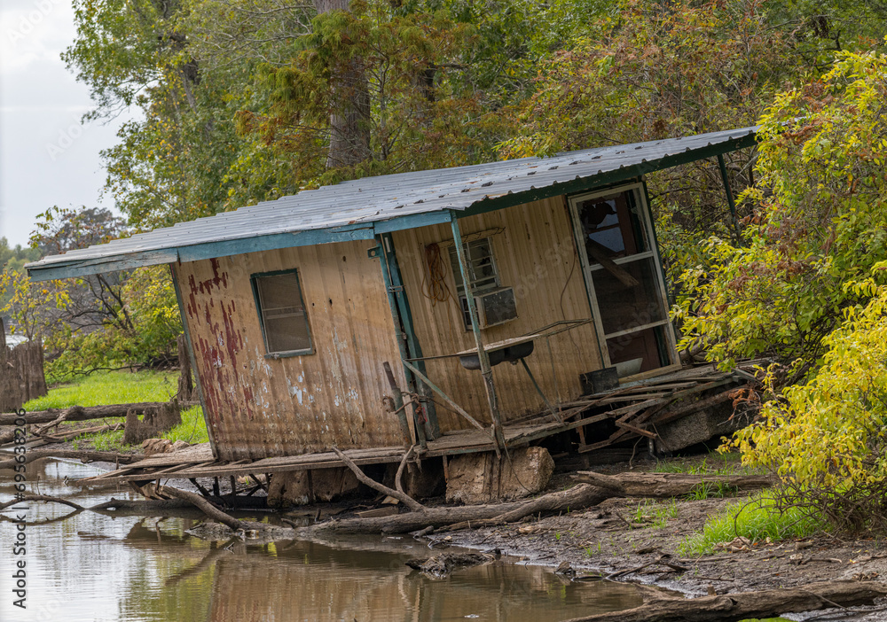 Collapsing abandoned cabin on the banks by calm waters of the bayou of Atchafalaya Basin near Baton Rouge Louisiana