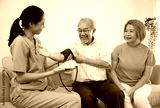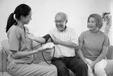 caregiver or nurse measure blood pressure to senior man on sofa