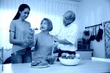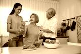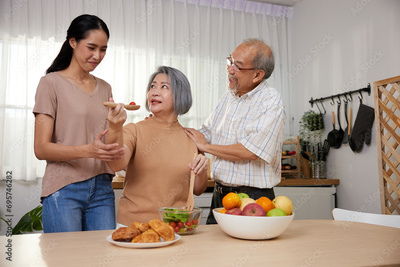 asian family senior couple and granddaughter enjoy cooking salad in the kitchen