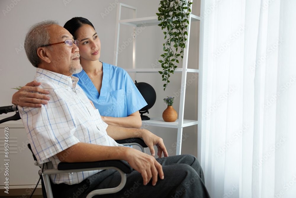 nurse or caregiver beside elderly man sitting on wheelchair and looking outside at home