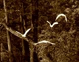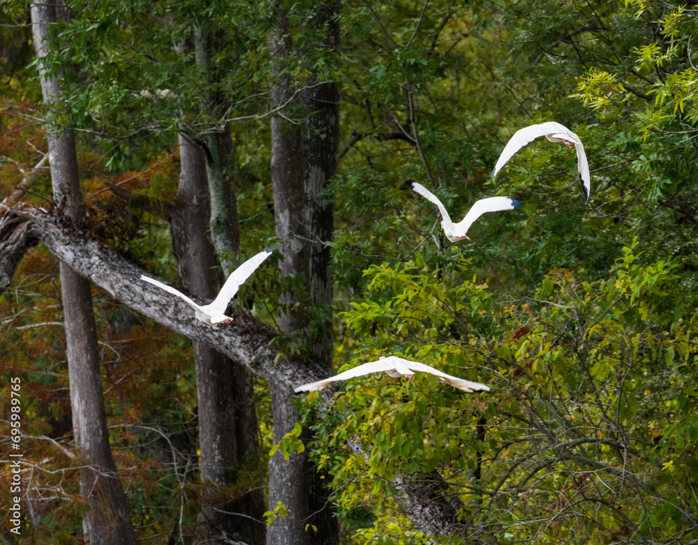 Four American white ibis birds flying away in the trees of Atchafalaya Basin near Baton Rouge Louisiana