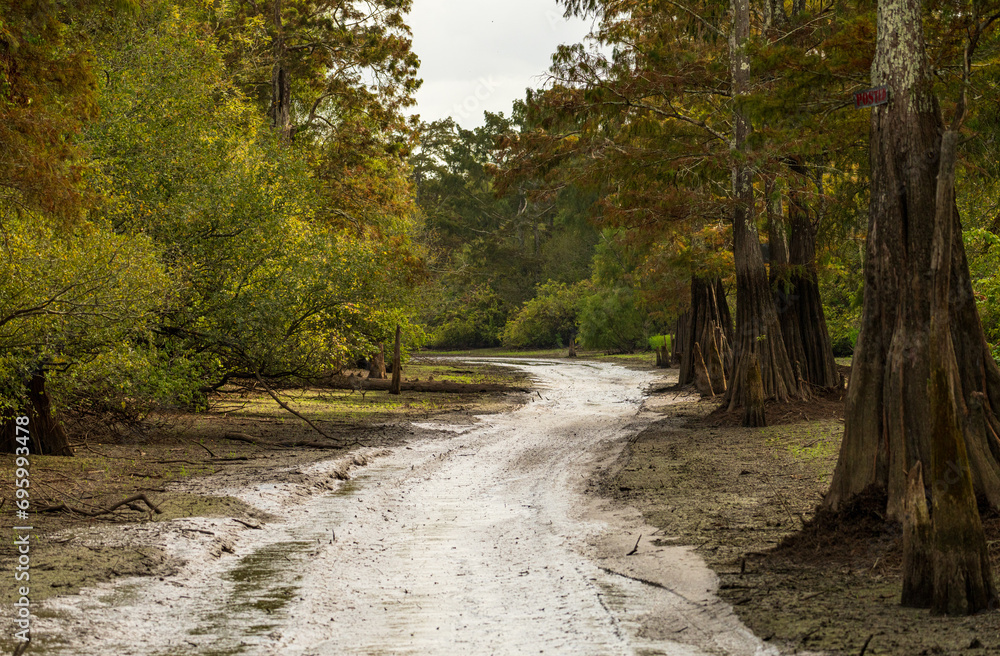Muddy channel or pathway taken by airboat tours of the bayou of Atchafalaya Basin near Baton Rouge Louisiana
