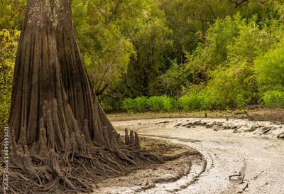 Muddy channel or pathway taken by airboat tours of the bayou of Atchafalaya Basin near Baton Rouge Louisiana