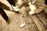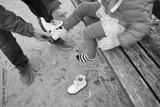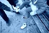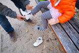 child, 4-year-old girl, sits on bench in park while man puts on shoes, white boots, Family bond between parent and child during everyday activities, Multigenerational Connection
