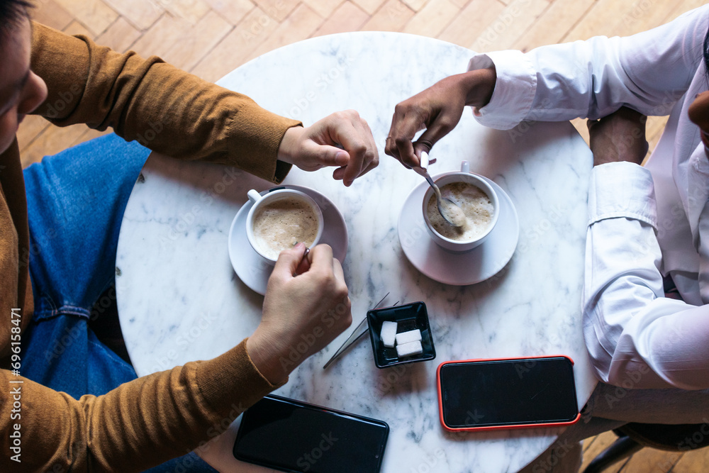 Overhead shot of two people on a date drinking coffee