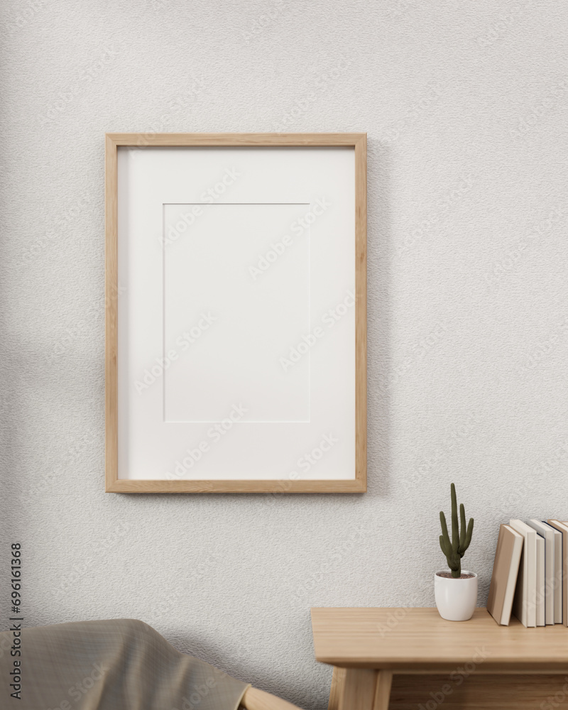 Minimal Scandinavian living room with a blank wooden picture frame mockup hanging on the white wall.