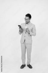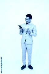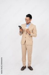 A handsome Asian businessman is using his smartphone, standing on an isolated white background.