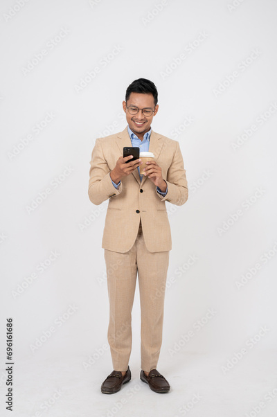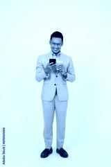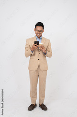 A handsome Asian businessman is using his smartphone, standing on an isolated white background.