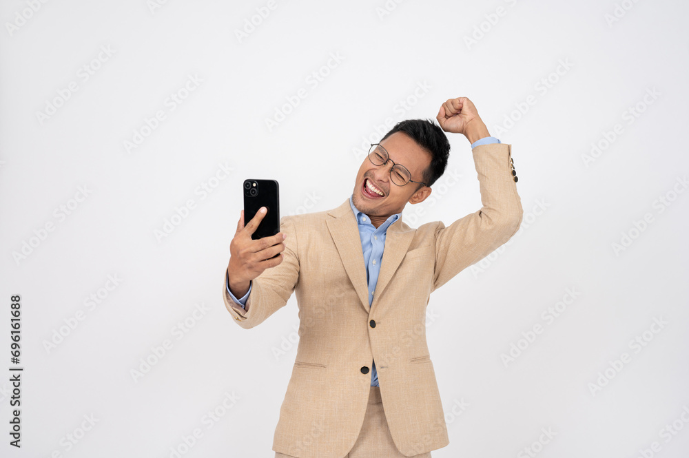 Excited Asian businessman is looking at his phone with a super happy face. getting a job promotion