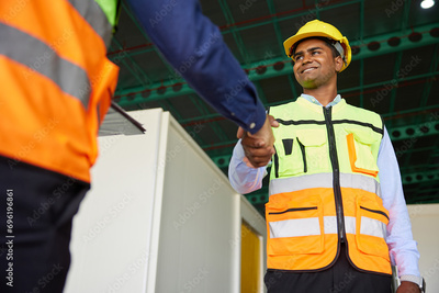 workers shaking hands before starting work in the warehouse storage