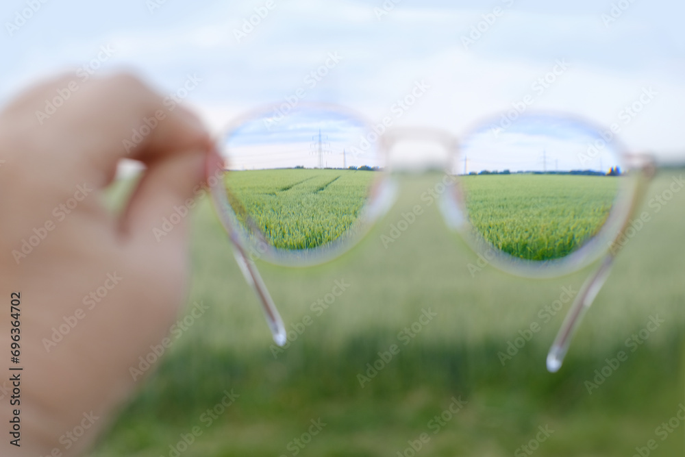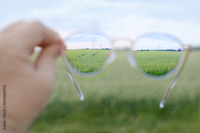 closeup glasses in female hands, wheat field in lenses, cleanliness and transparency of lenses, concept of harvest of bread, eyewear accessories, food crisis, lens care products, clear optics