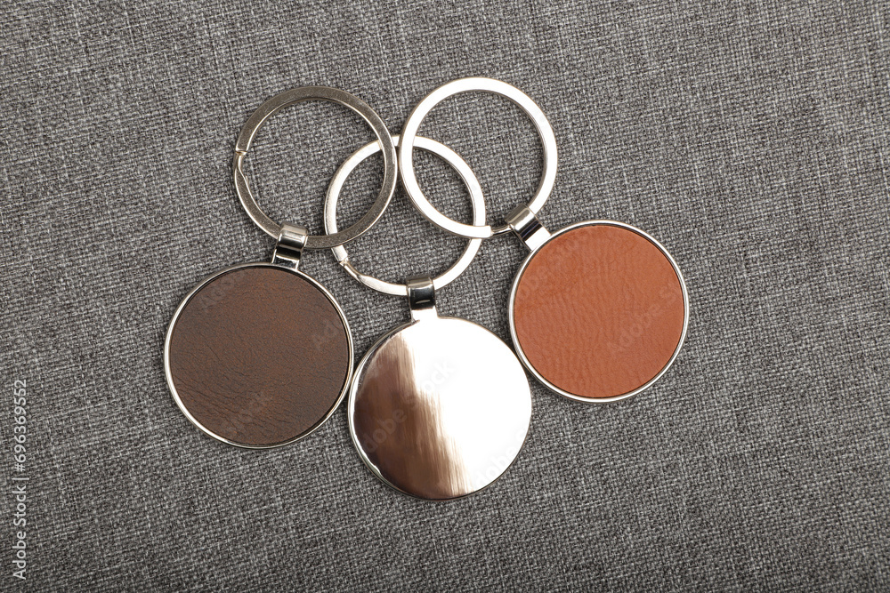 Metal and leather keychains. Colorful one side leather; Square, rectangle and circle shaped key rings. Concept shots, photos taken specially for e-commerce sales.