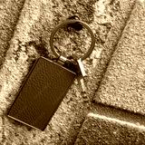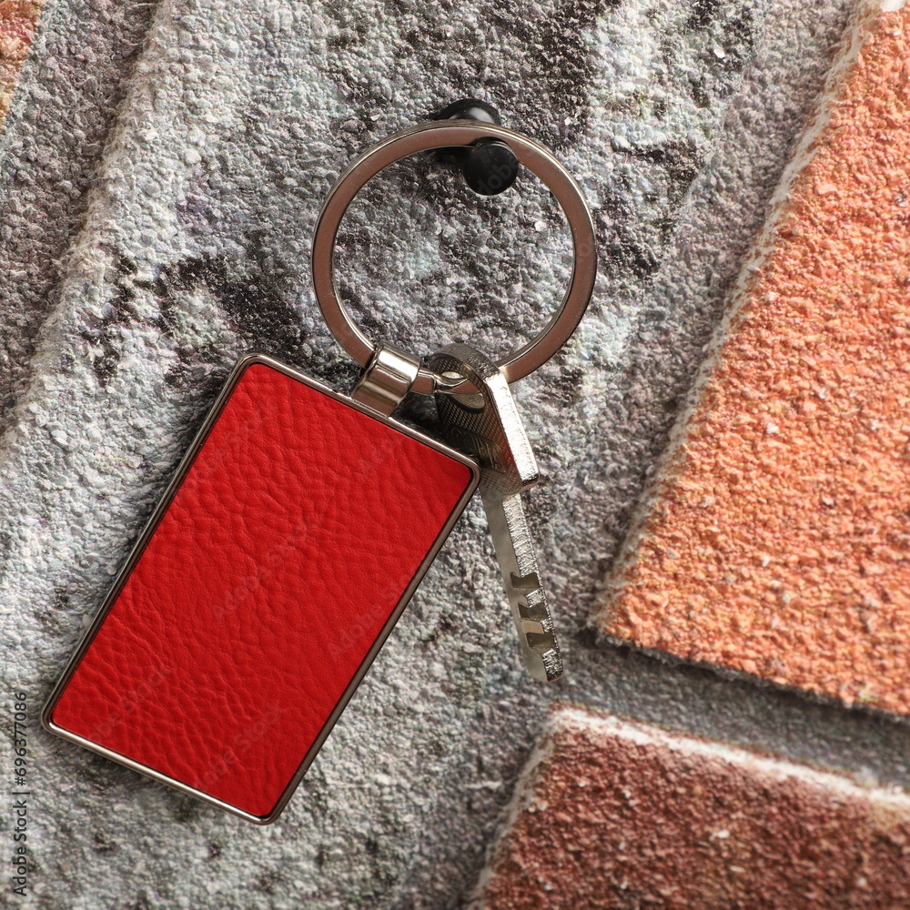 Metal and leather keychains. Colorful one side leather; Square, rectangle and circle shaped key rings. Concept shots, photos taken specially for e-commerce sales.