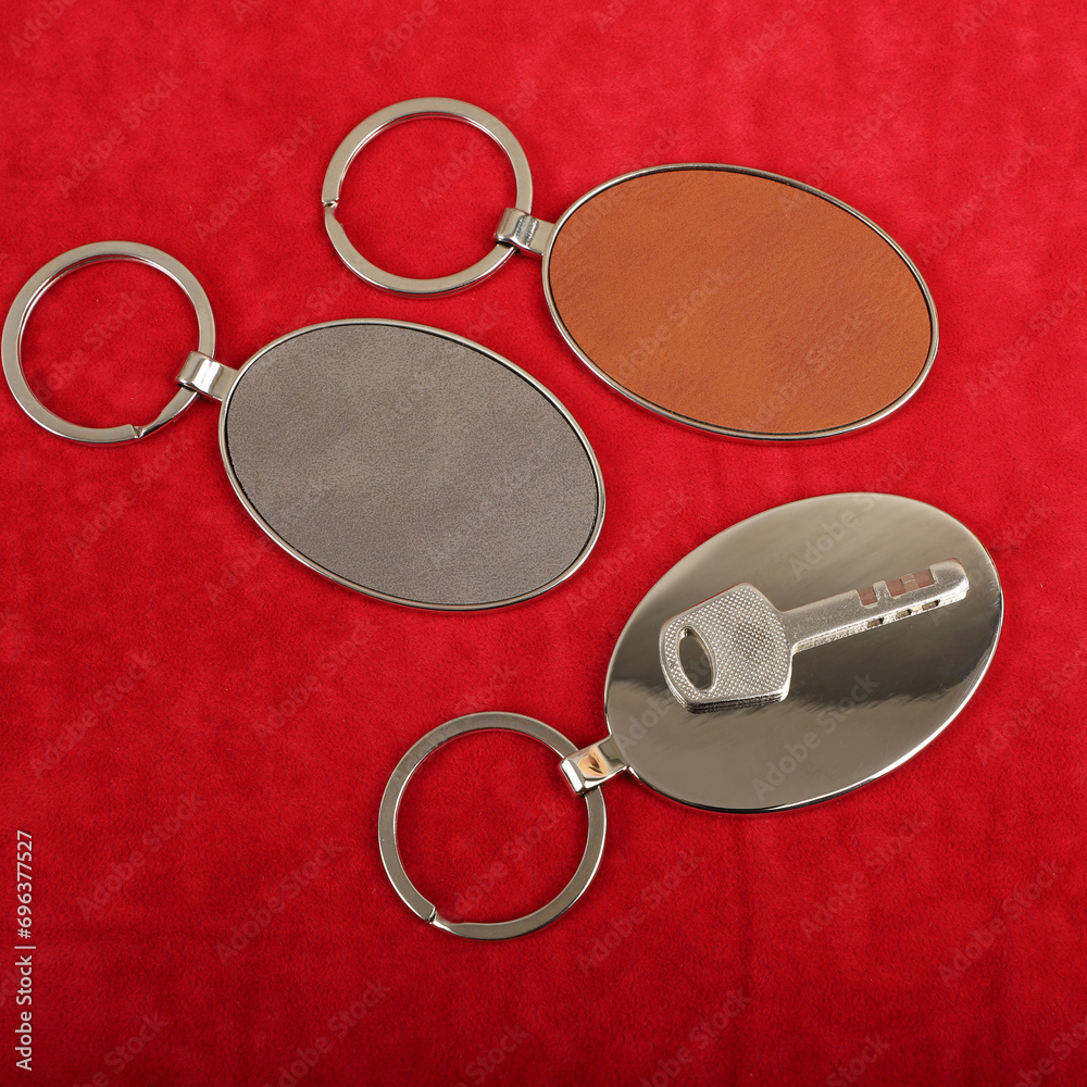 Metal and leather keychains. Colorful one side leather; Square, rectangle and circle shaped key rings. Concept shots, photos taken specially for e-commerce sales.