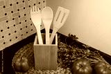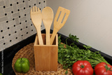 Wooden Bamboo Utensil Holder, bamboo kitchen utensils, Bamboo Utensil Holder, Garden Salad, Bamboo Salad Set, close-up and concept shot. e-commerce photos, free space for writing,