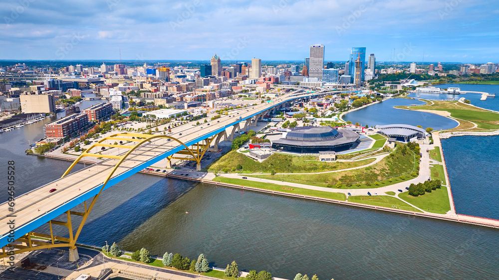 Aerial View of Milwaukee Hoan Bridge and Urban Skyline