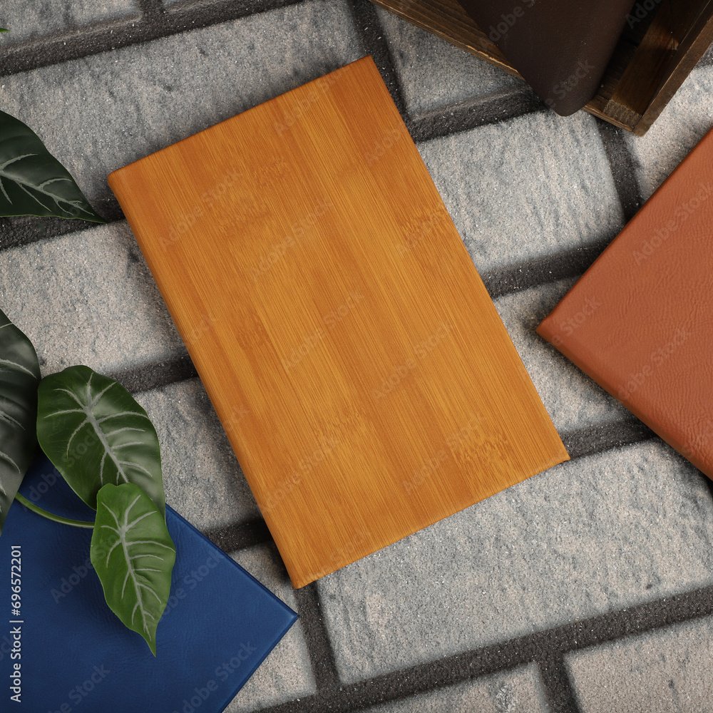 Leather Journals and Notebooks in bamboo colors. Concept shot, top view. Custom background Journals and Notebooks view. Leather Sketchbook. Space Blank for text