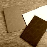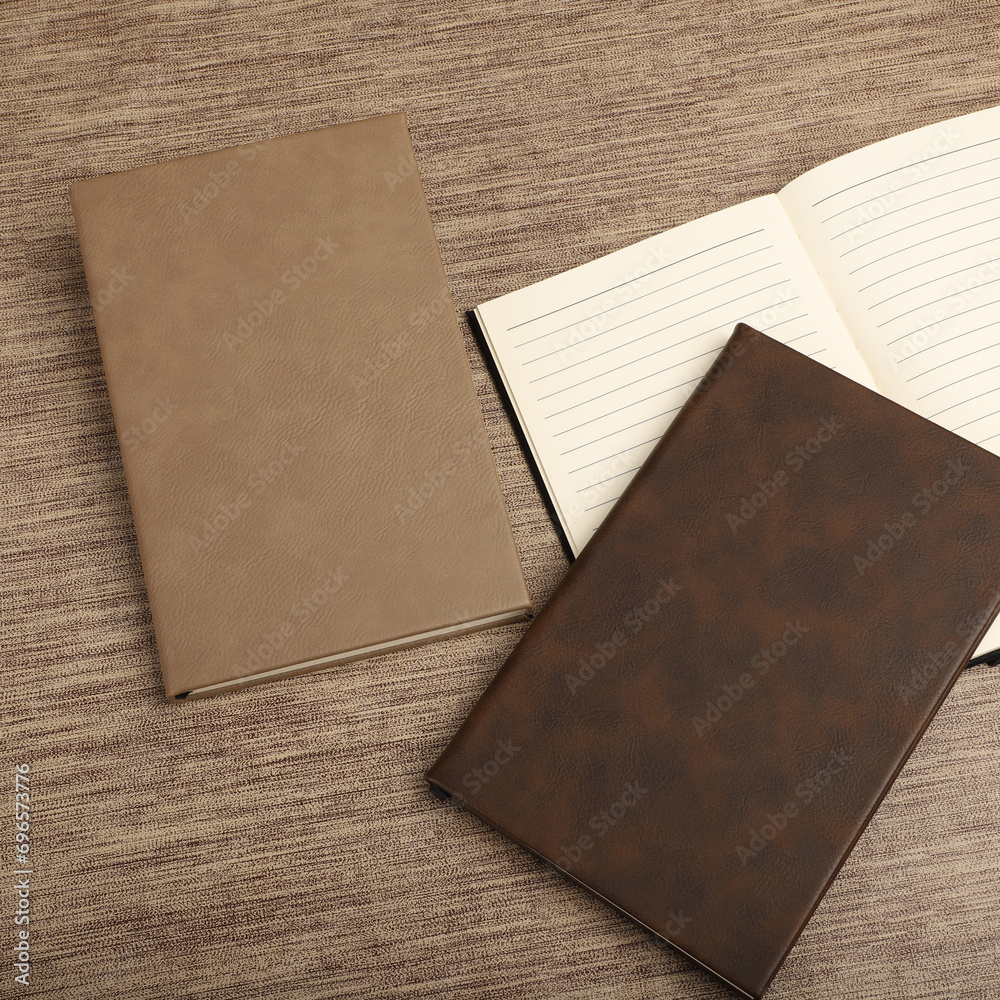 Leather Journals and Notebooks in rustic brown colors. Concept shot, top view. Custom background Journals and Notebooks view. Leather Sketchbook. Space Blank for text