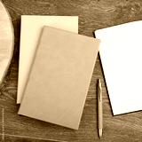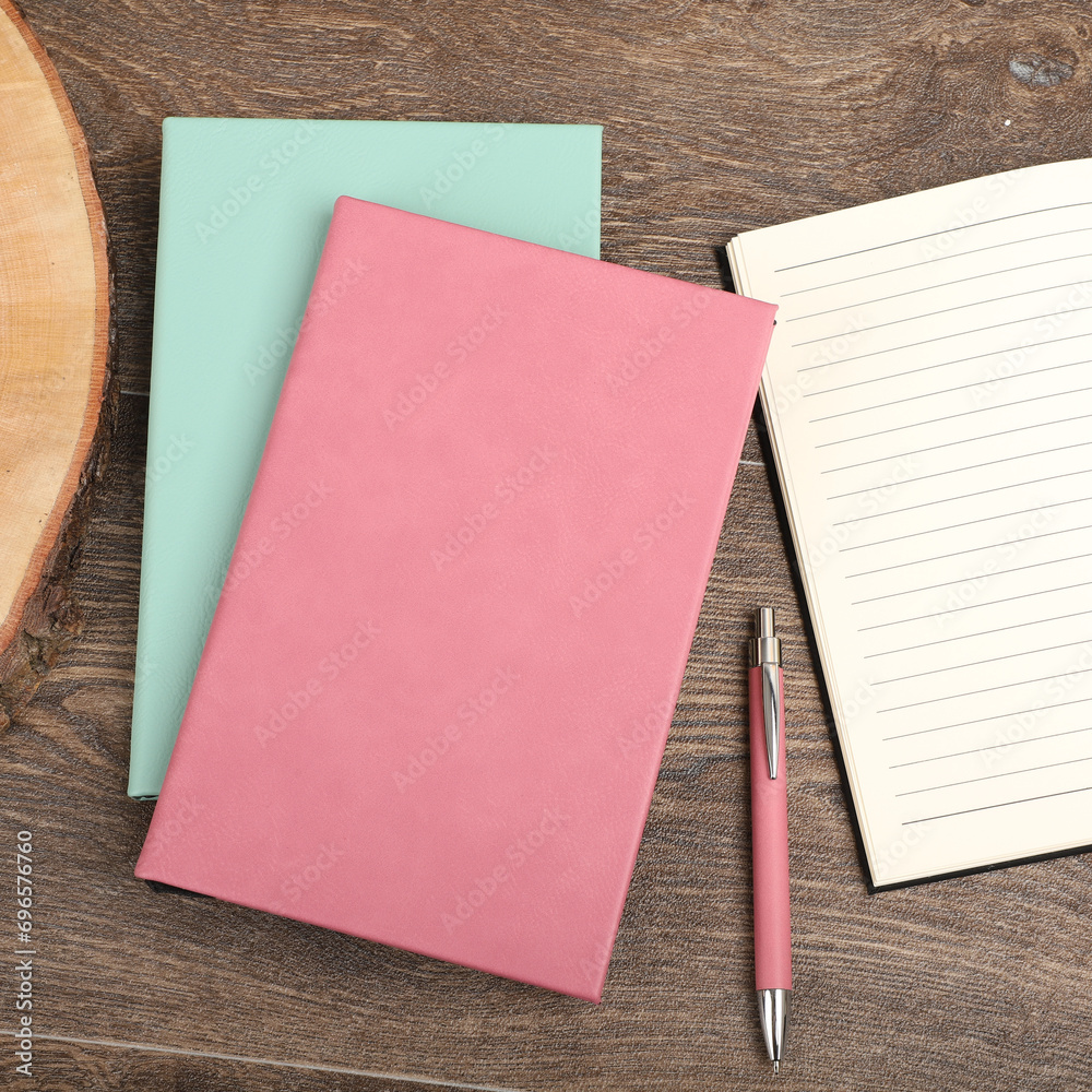 Leather Journals and Notebooks in pink and teal colors. Concept shot, top view. Custom background Journals and Notebooks view. Leather Sketchbook. Space Blank for text