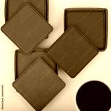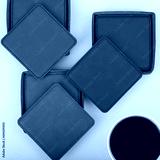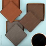 Leather table mats in different colors. Concept shot, top view. Custom background view of leather table coaster. Stitched and leather table coaster