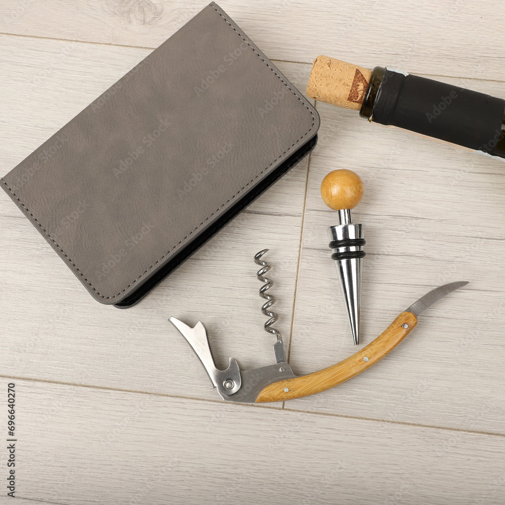 Wine opener set in leather box. Colorful leather boxes. Wine opener and cork. Close-up, top view, no people. Concept shot.