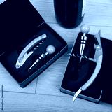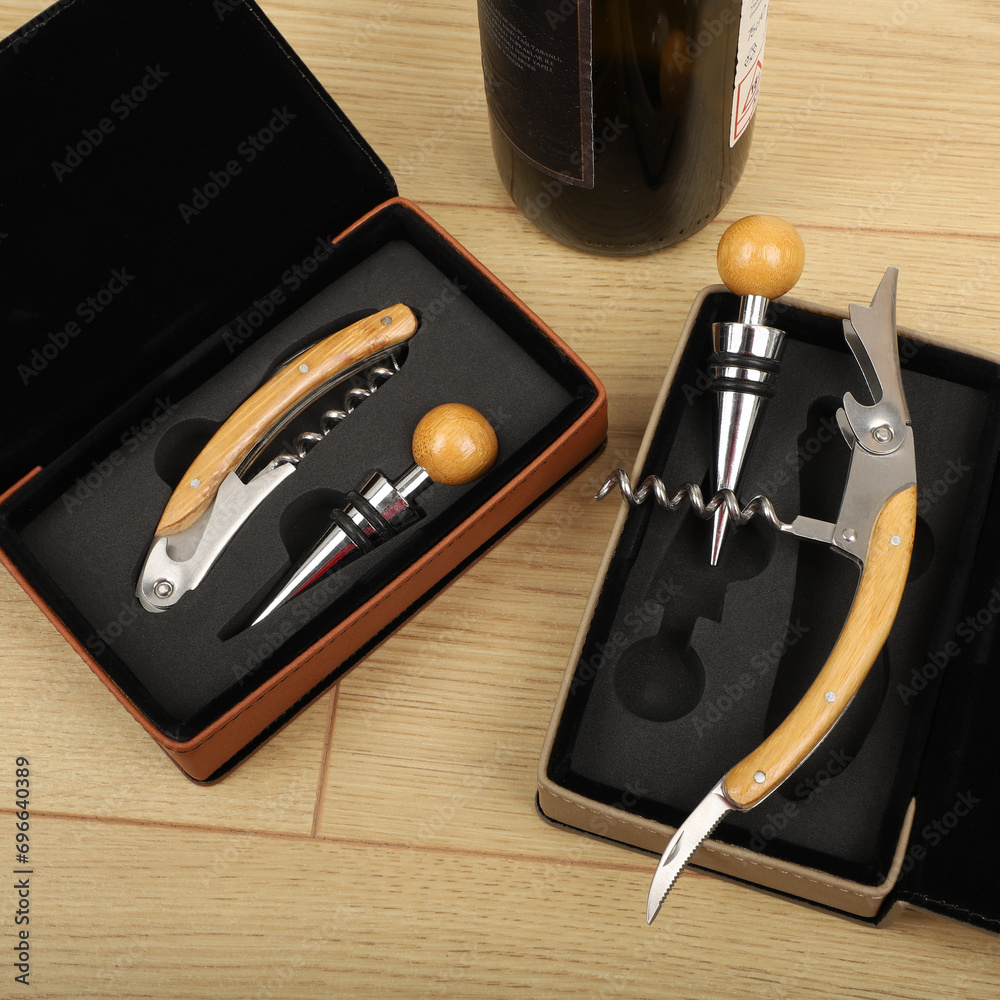 Wine opener set in leather box. Colorful leather boxes. Wine opener and cork. Close-up, top view, no people. Concept shot.