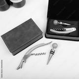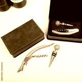 Wine opener set in leather box. Colorful leather boxes. Wine opener and cork. Close-up, top view, no people. Concept shot.