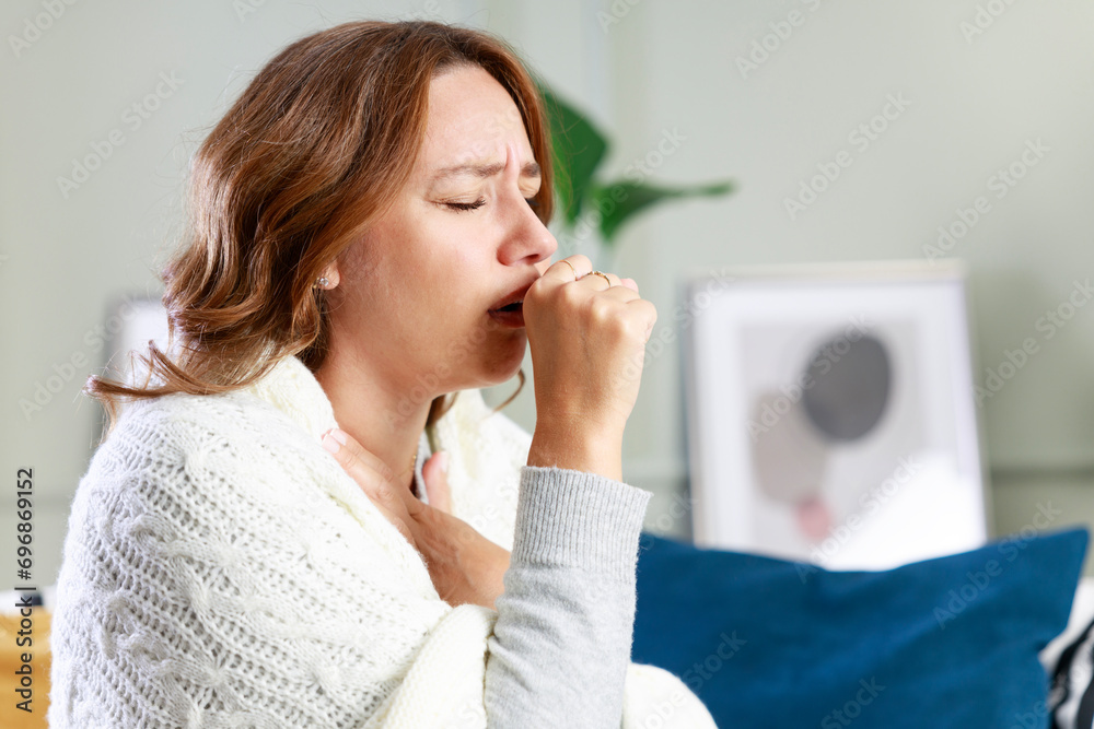 Sick woman sitting on couch and coughing while suffering from sore throat