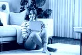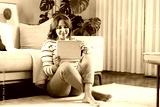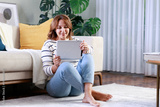 Young woman using her tablet pc while sitting on the floor at home