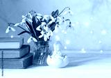 Snowdrop flowers, books and little Buddha figurine on table, abstract light background. spring season. esoteric spiritual practice for Relaxation, harmony soul, meditation, life balance