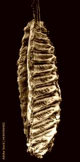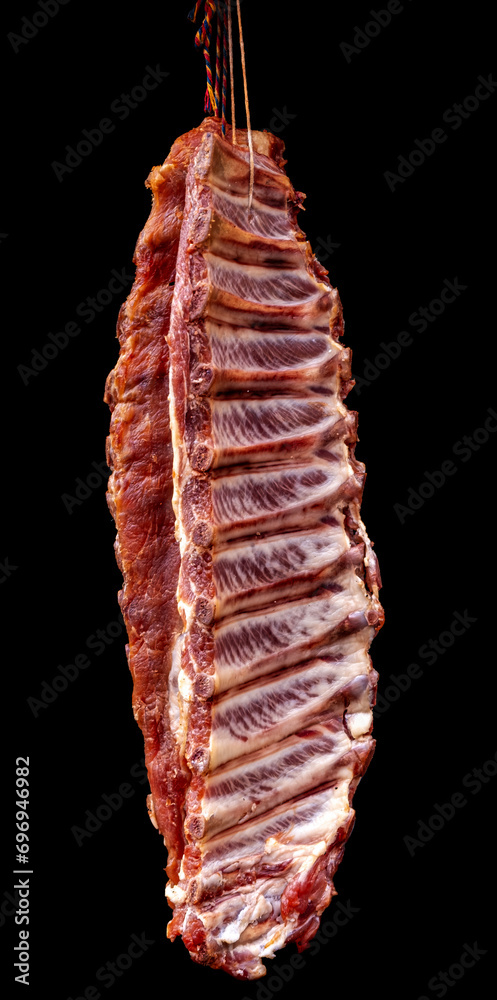 Traditional homemade Romanian dry smoked pork ribs hanging on string