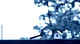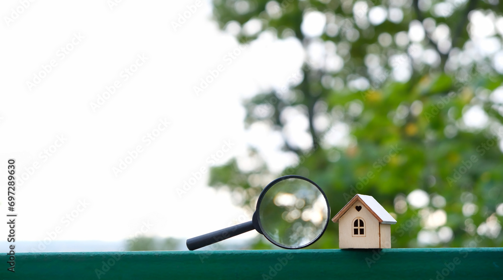 toy house and magnifying glass outdoor, nature abstract background. Symbol of family. Real estate, construction, mortgage, construction, rental housing concept. home realtor. copy space