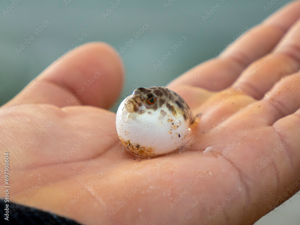 baby newborn tiny inflated small puffer fish on a fisherman hand in baja california sur, mexico, cabo pulmo marine park