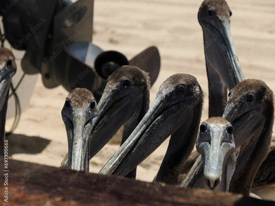 many pelicans are begging for fresh fish food in fisherman beach Punta Lobos near todos santos, pacific ocean baja california sur mexico