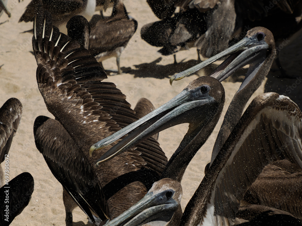 many pelicans are begging for fresh fish food in fisherman beach Punta Lobos near todos santos, pacific ocean baja california sur mexico