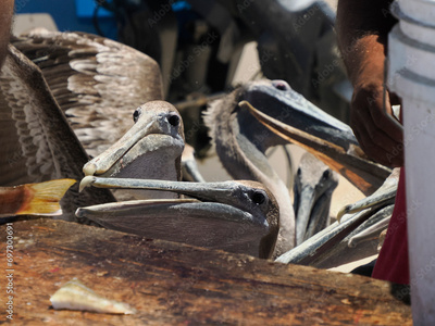 many pelicans are begging for fresh fish food in fisherman beach Punta Lobos near todos santos, pacific ocean baja california sur mexico