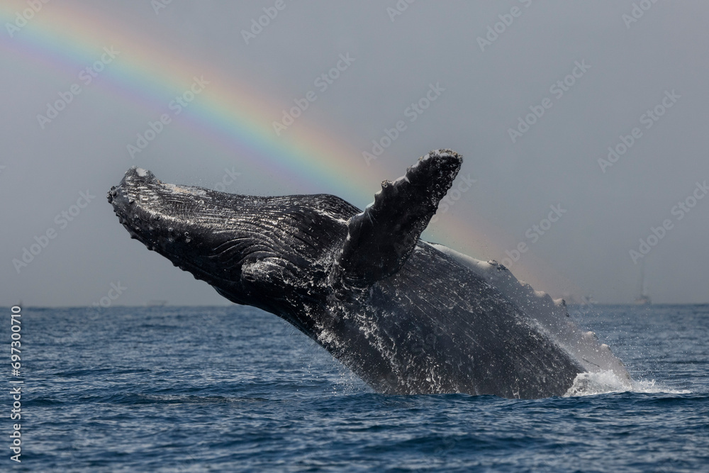 humpback whale breaching in pacific ocean cabo san lucas mexico on rainbow sky background
