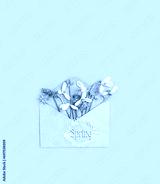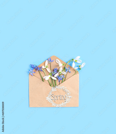 snowdrop flowers in paper envelope on abstract blue background. spring season concept. floral composition in minimal style. flat lay. template for design