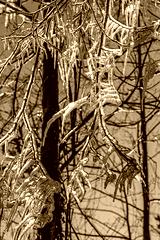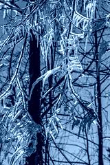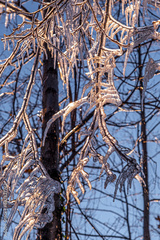 Tree branch covered with ice. Glaciated tree branches, consequences after freezing rain.