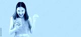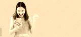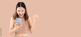 Happy and excited young woman using mobile phone standing over isolated on beige background and copy space Young girl using smartphone for shopping online chat and texting message She get surprised