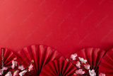 Decking out for a memorable Chinese New Year celebration. Top view shot of red paper fans, sakura bloom on red background with advert placement