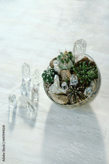 clear quartz gemstones and succulents, cacti plant in florarium on table. Minerals for Crystal Magic Ritual. Witchcraft, spiritual practice for Relaxation, meditation, Harmony life balance. top view
