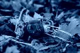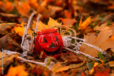 Glass candy basket with Halloween face in autumn leaves in the park