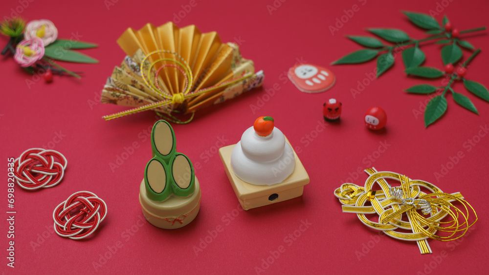 日本のお正月イメージ|鏡餅・門松・水引と赤背景