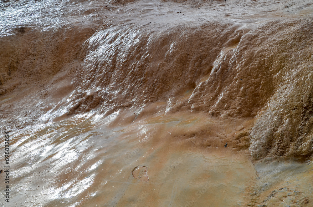 Jvari Pass travertine natural monument is calcareous sinter or tufa mixture of ferrous salts covered with a thin layer of transparent water. Natural texture or background from Georgia
