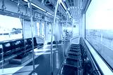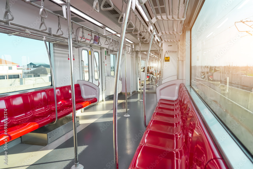 Red plastic seats and chrome handrails inside an electric train carriage car