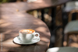 Hot art Latte Coffee. Background Coffee cup and beans on old kitchen table.