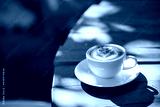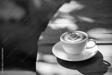 Hot art Latte Coffee. Background Coffee cup and beans on old kitchen table.